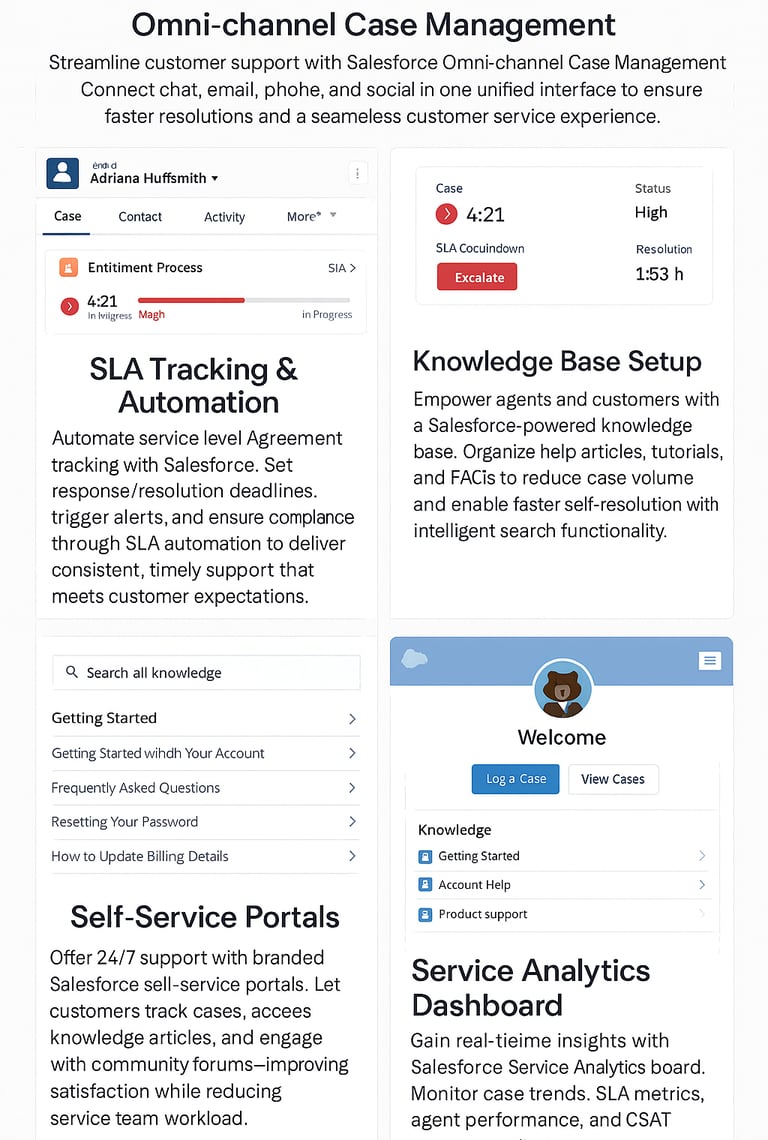 One of the most powerful aspects of Salesforce Service Cloud is its omnichannel capability. Today’s customers interact through phone, email, chat, social media, and self-service portals. Service Cloud seamlessly integrates all these touchpoints, ensuring: